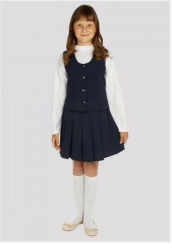 Ткань: 100% полиэстер Жилетка- юбка для школьников. Жилет с подрезными боками.Юбка с запахом,талия регулируется за счет запаха,запах заложен складками,сзади юбка форма трапеции, отдельно юбку можно посмотреть на сайте ю-13. Длина пиджака по спинке 38размер-44см Длина юбки: 38размер-48см