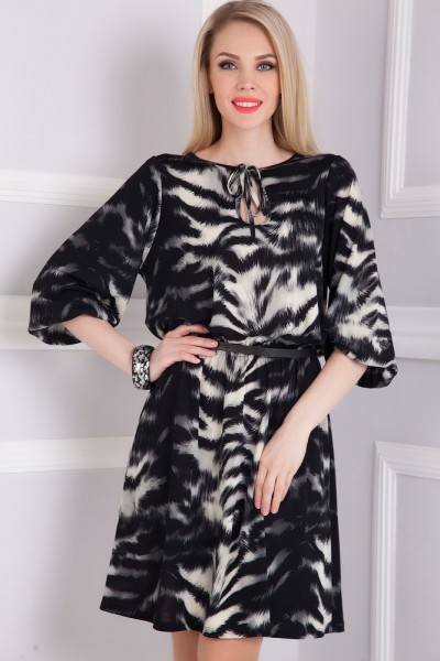 Элегантное свободное платье с пышным рукавом. - изделие прямого силуэта - круглый вырез горловины с "капелькой" и декоративной завязкой - широкий втачной рукав-баллон, укороченный до локтя - мягкий драпирующийся трикотаж с монохромным "хищным" принтом - классический стиль - ремень в комплект не входит