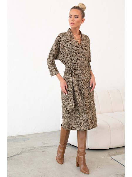 Платье из эластичного полотна с жаккардовым анималистичным узором. Изделие свободное в верхней части и прилегающее в области талии и бёдер. Лиф изделия оригинального кроя в стиле кимоно. Цельнокроеная стойка переходящая в запах, визуально делает фигуру стройнее. По центру задней части платья выполнен шов, снизу небольшой разрез. В комплекте пояс. Маломерит, тел. 89142739020, только ватсап, в пагер редко захожу, цена 1959 руб.